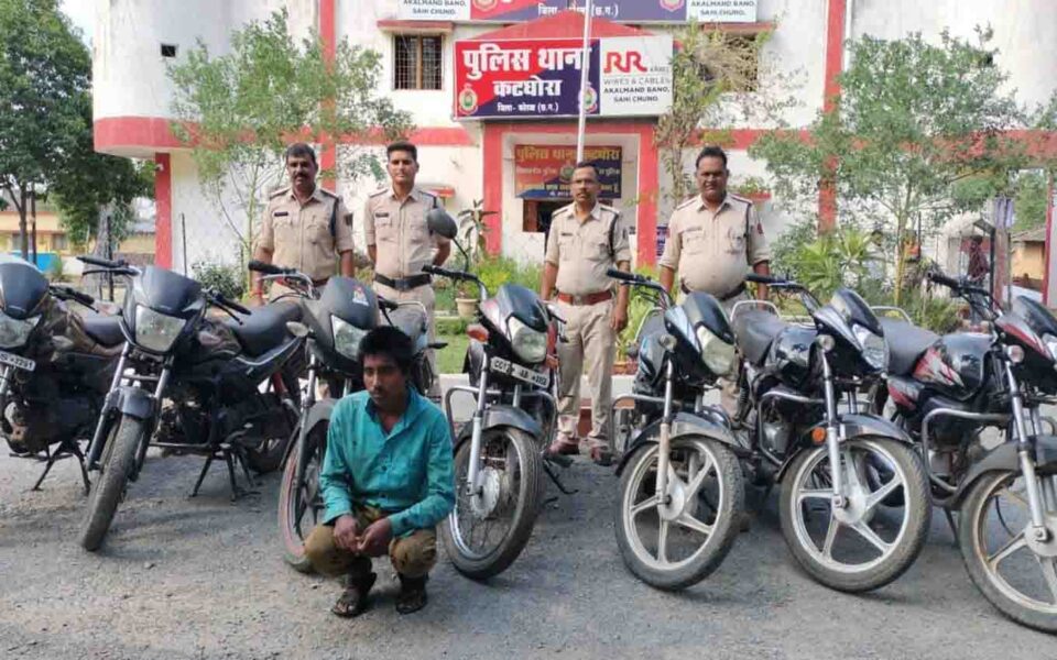 कोरबा | पुलिस अधीक्षक सिद्धार्थ तिवारी द्वारा जिले में चोरी की घटना पर अंकुश लगाने हेतु प्रभावी कार्यवाही करने हेतु सभी थाना प्रभारियों को निर्देशित किया गया है। जिसके तारतम्य में अतिरिक्त पुलिस अधीक्षक यू बी एस चौहान एवं अतिरिक्त पुलिस अधीक्षक कटघोरा नेहा वर्मा एवं एसडीओपी कटघोरा पंकज ठाकुर के द्वारा थाना प्रभारी कटघोरा धर्म नारायण तिवारी को निर्देशित करते हुए कटघोरा व आसपास के क्षेत्र में हुई मोटर सायकल की चोरी की पतासाजी व बरामदगी हेतु टीम गठित करते हुए सघन जांच की गई। जिसमें मुखबिर की सूचना पर कटघोरा पुलिस के द्वारा कटघोरा क्षेत्र से दिनांक 12/5/24 को चोरी हुए मोटर सायकल होण्डा लियो चलाते हुए व्यक्ति को हिरासत में लेकर पूछताछ किया जो स्वयं को ग्राम कामता, थाना शिवरीनारायण जिला जांजगीर चांपा का निवासी आशीष मनहर होना बताया। जो बिलासपुर, कोरबा, कटघोरा क्षेत्र से मोटर सायकलों की चोरी कर 2 मोटर सायकल शिवरी नारायण अपने घर में तथा 4 मोटर सायकल अमलड़िहा के जंगल मे छुपा कर रखना तथा बेचने के लिए ग्राहक की तलाश करना बताया। आरोपी की निशानदेही पर कटघोरा पुलिस के द्वारा आरोपी के कब्जे से 4 हीरो डीलक्स, 1 हीरो पैशन प्रो, 1 होंडा शाइन, 1 होंडा लियो कुल 7 मोटर सायकल बरामद कर आरोपी पर विधिवत कार्यवाही कर न्याययिक रिमांड पर जेल दाखिल किया। उक्त जानकारी कोरबा पुलिस विभाग के द्वारा प्रेस विज्ञप्ति के माध्यम से दी गई