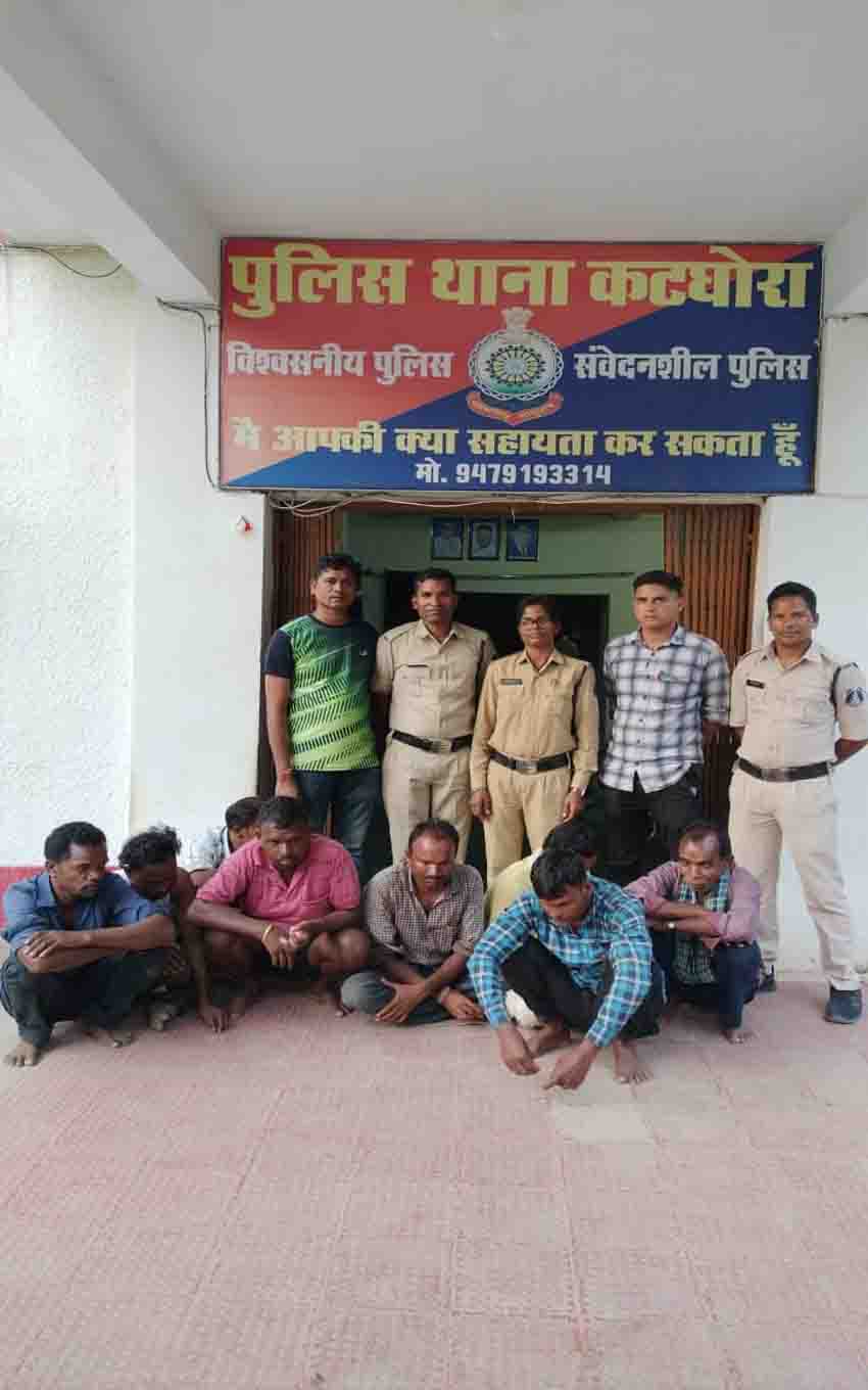 इस बड़ी कार्यवाही में कटघोरा पुलिस ने आरोपी रामायण दास, उम्र 61 वर्ष निवासी बरबसपुर, वृंदावन यादव उम्र 35 वर्ष निवासी ग्राम अरदा, राजेन्द्र सिंह गोंड उम्र 40 वर्ष निवासी जड़गा, रामकुमार पटेल उम्र 40 वर्ष निवासी ग्राम बिंझरा, राम कुमार कंवर उम्र 40 वर्ष निवासी ग्राम बिंझरा, रामनारायण सांवरा उम्र 34 वर्ष निवासी ग्राम आमाखोखरा, राजकुमार गढेवाल उम्र 34 वर्ष निवासी ग्राम बिंझरा, गौतम गोश उम्र 34 वर्ष निवासी को गिरफ्तार करते हुए जुआ एक्ट के तहत कार्यवाही की गई। इस पूरी कार्रवाई में प्रधान आरक्षक दीपक कश्यप, आरक्षक महेंद्र चंद्रा, आरक्षक रमेश कश्यप, आरक्षक मनीष साहू, आरक्षक राजकुमार, आरक्षक विवेक जोशी, आरक्षक वीरेंद्र पटेल शामिल थे। इन पुलिसकर्मियों ने अत्यधिक सतर्कता और कुशलता से इस ऑपरेशन को अंजाम दिया। उक्त जानकारी पुलिस विभाग ने प्रेस विज्ञप्ति के माध्यम से दी गई