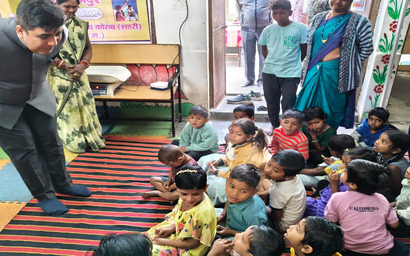 कलेक्टर ने बच्चों को विभिन्न रंग दिखाकर रंगों की पहचान कराई तथा सब्जियों और फलों के चित्रों के माध्यम से उनके पोषण महत्व पर चर्चा की। बच्चों ने उत्साहपूर्वक प्रश्नों के उत्तर दिए और गतिविधियों में भाग लेने वाले सभी बच्चों को चॉकलेट वितरित की गई।