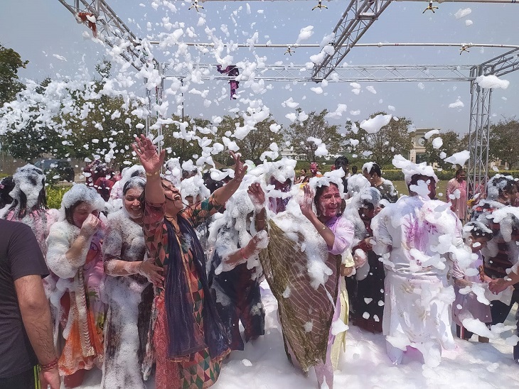 आनंदम सोसाइटी में खास तौर पर एक ऐसी मशीन लगाई गई थी, जिसमें से झाग की बारिश हो रही थी। बारीक-बारीक झाग हवा में ऐसे उछल रही थी मानो बर्फ की बारिश हो रही हो। लोग इस झाग में डांस करते हुए होली सेलिब्रेट कर रहे थे। कॉलोनी के विजय अग्रवाल ने बताया कि इस मौके पर सोसाइटी के सभी बड़े, बच्चे, महिलाएं दिल खोलकर जश्न मनाते नजर आए।